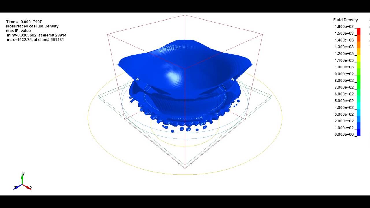 www.youtube.comПримером такого процесса является Explosion Bulge Test. В ходи данного испытания ударная волна от подрыва сферического зарада распространяется через жидкости или газ до детали. Я решил набросать пример такого расчета в LS-DYNA, а заодно нашел статью с решением подобных задач.