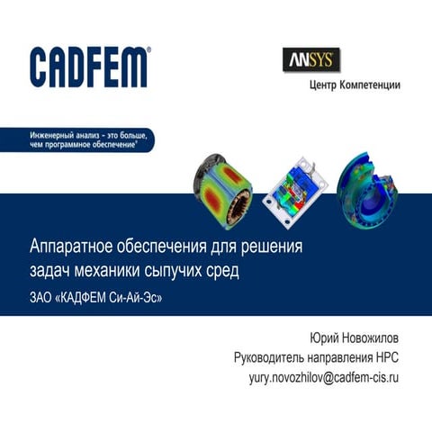 Aппаратное обеспечения для решения задач механики сыпучих сред Документ описывает деятельность компании ЗАО «Кадфем Си-Ай-Эс» в области высокопроизводительных вычислительных систем, включая проектирование, внедрение и поддержку вычислительных центров. Представлены результаты тестирования производительности алгоритмов при использовании процессоров Intel и графических процессоров NVIDIA в задачах механики сыпучих сред. Также обсуждаются рекомендации по выбору аппаратного обеспечения для оптимизации расчётов. - Download as a PPTX, PDF or view online for free www.slideshare.net